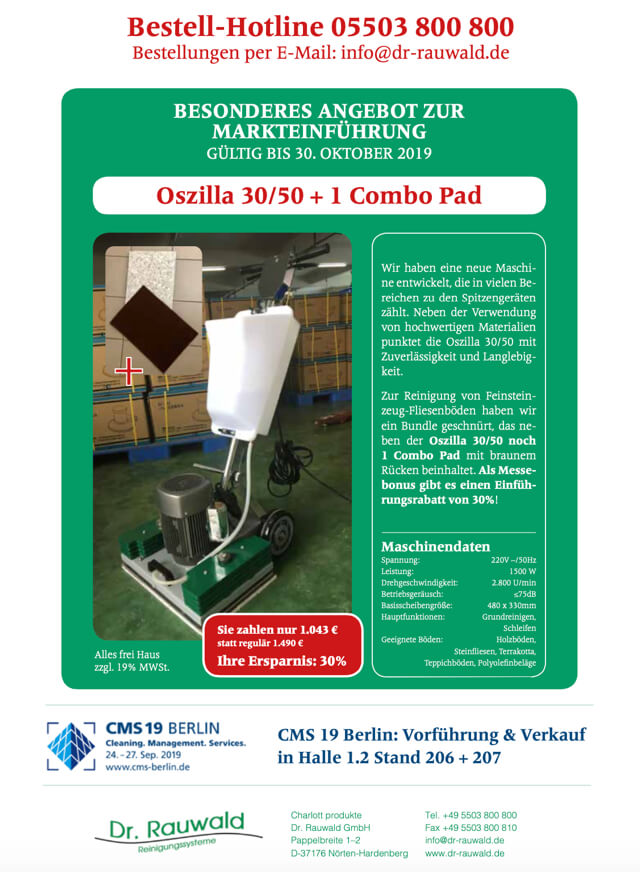 Wieder geht es um Fußbodenreinigung, wieder können unsere Chemie und unsere Spezialpads sich nahtlos in ein neues System einfügen. Oszillierende Bodenreinigungsmaschinen haben unbestrittene Vorteile gegenüber herkömmlichen Einscheibenmaschinen. Allerdings waren die bisher auf den Markt zu Luxuspreisen erhältlichen Maschinen unausgereift. Sie waren zu laut, die Handhabung war insbesondere für Frauen beschwerlich und die Haltbarkeit einzelner Komponenten ließ zu wünschen übrig.